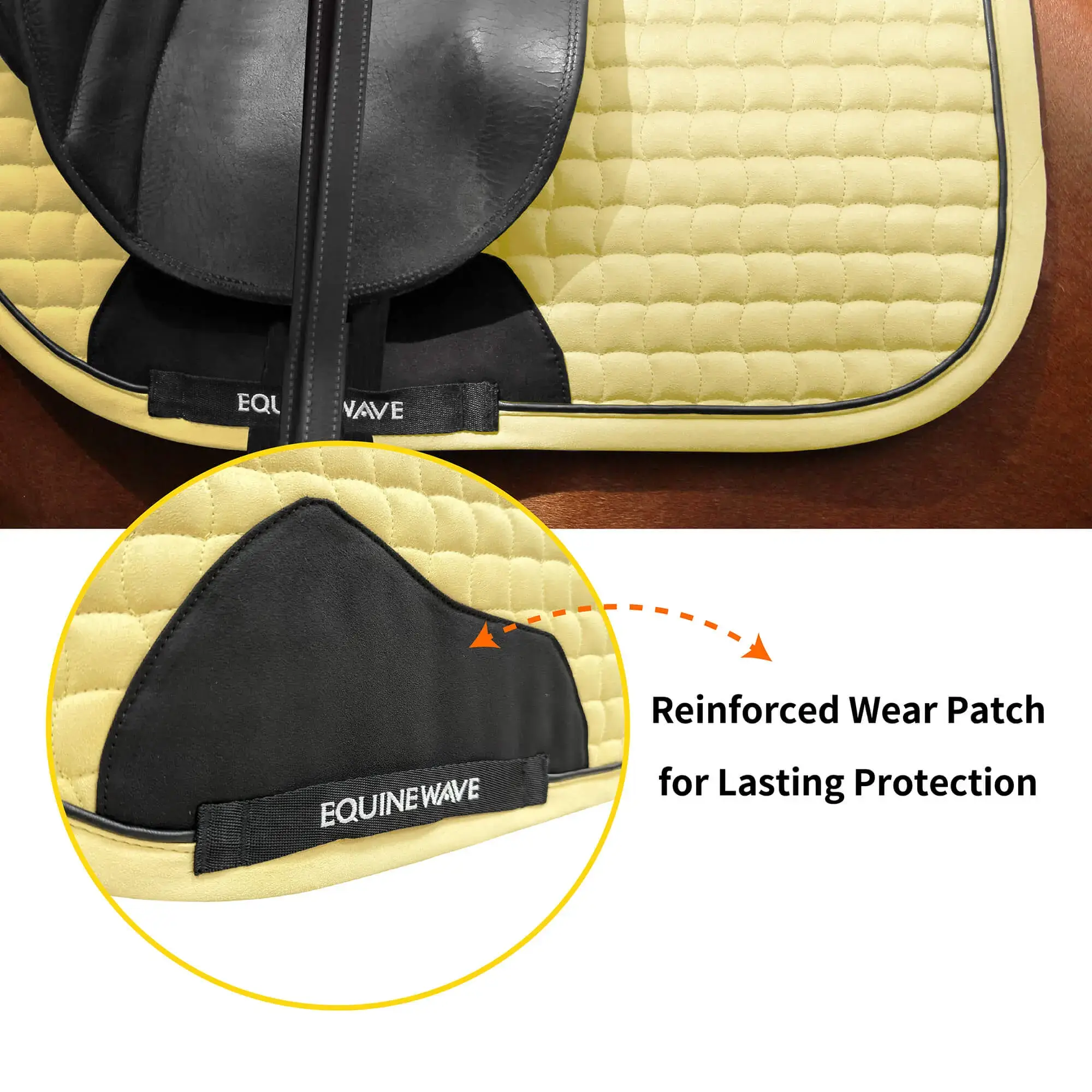 Reinforced Wear Patch for lasting Protection: A designed suede-effect panel resists friction from girth straps and leg movement, ensuring long-term durability without compromising the pad’s elegant finish.