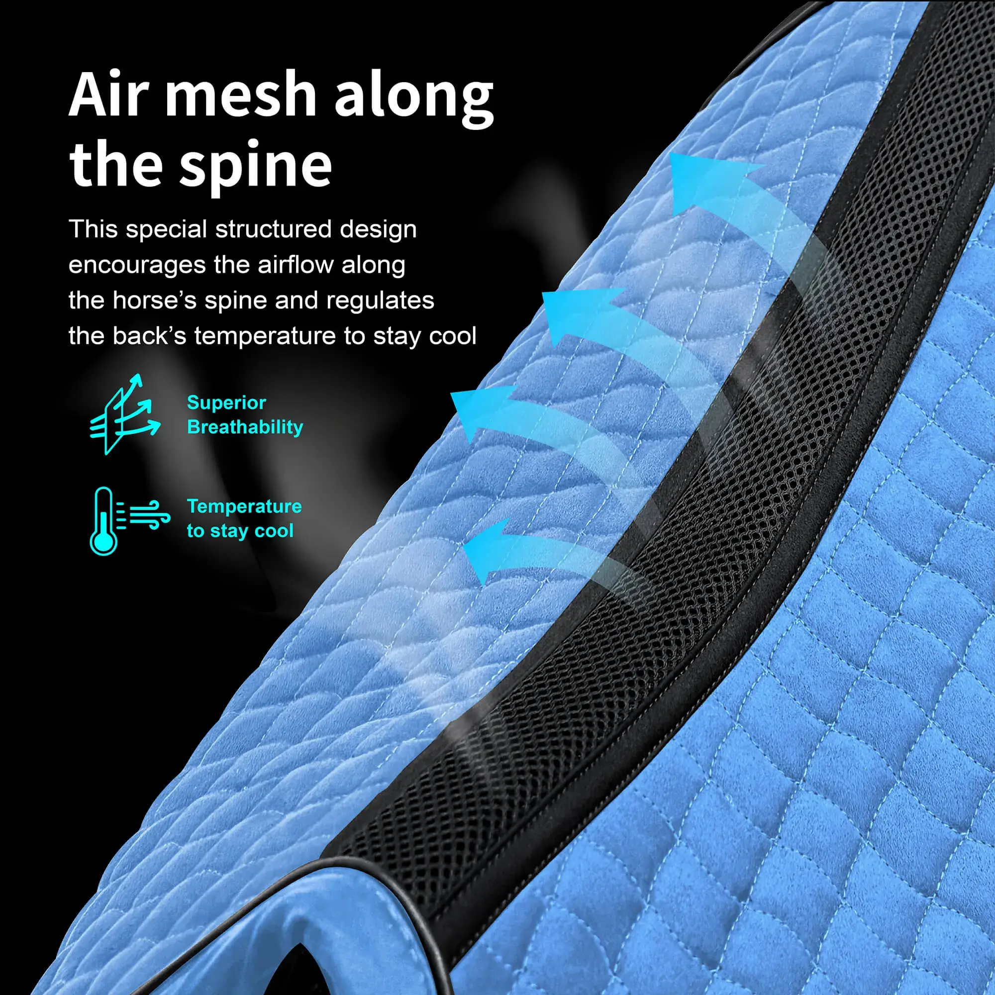 Air mesh along the spine: This special structured design encourages the airflow along the horse’s spine and regulates the back’s temperature to stay cool.